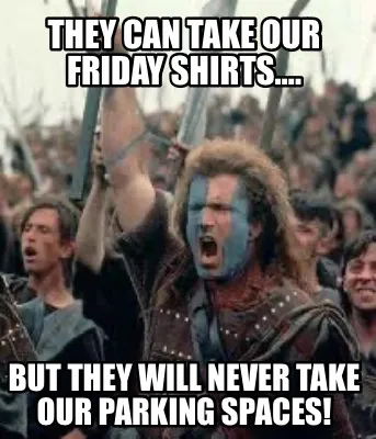 They can take our Friday Shirts…. But they will never take our parking spaces! Meme Template