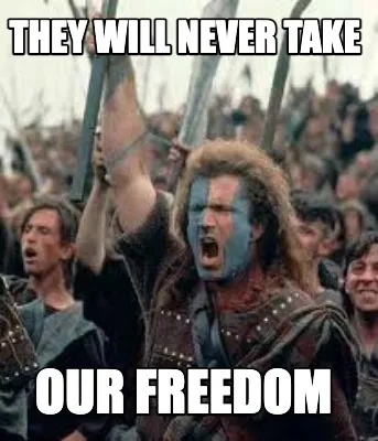 Make your own "They will never take our freedom" meme with MemeCreator's free online meme generator. Add text, stickers, and drawings — then download or share. No watermark, no sign-up required.