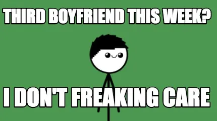 Make your own "Third boyfriend this week? I don't freaking care" meme with MemeCreator's free online meme generator. Add text, stickers, and drawings — then download or share. No watermark, no sign-up required.