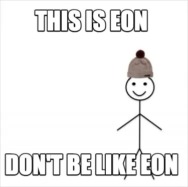 Make your own "This is EON Don't be like EON" meme with MemeCreator's free online meme generator. Add text, stickers, and drawings — then download or share. No watermark, no sign-up required.