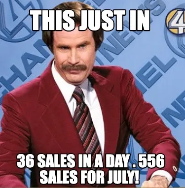 THIS JUST IN 36 sales in a day . 556 sales for July! Meme Template