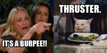 Make your own "Funny Thruster. It’s a burpee!!" meme with MemeCreator's free online meme generator. Add text, stickers, and drawings — then download or share. No watermark, no sign-up required.