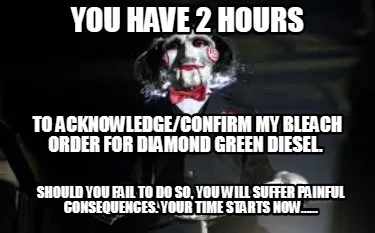 To acknowledge/confirm my bleach order for diamond green diesel. Should you fai Meme Template