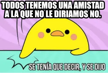 Make your own "Todos tenemos una amistad a la que no le diriamos no." meme with MemeCreator's free online meme generator. Add text, stickers, and drawings — then download or share. No watermark, no sign-up required.