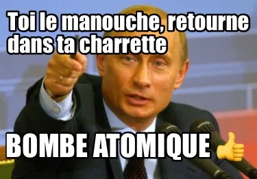 Make your own "Funny Toi le manouche, retourne dans ta charrette BOMBE ATOMIQUE ????" meme with MemeCreator's free online meme generator. Add text, stickers, and drawings — then download or share. No watermark, no sign-up required.