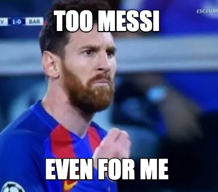 Make your own "Too Messi Even for me" meme with MemeCreator's free online meme generator. Add text, stickers, and drawings — then download or share. No watermark, no sign-up required.
