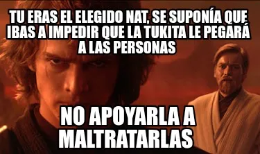 Make your own "Tu eras el elegido Nat, se suponía que ibas a impedir que la tukita le pegará" meme with MemeCreator's free online meme generator. Add text, stickers, and drawings — then download or share. No watermark, no sign-up required.