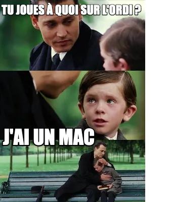 Make your own "Funny Tu joues à quoi sur l'ordi ? J'ai un Mac" meme with MemeCreator's free online meme generator. Add text, stickers, and drawings — then download or share. No watermark, no sign-up required.