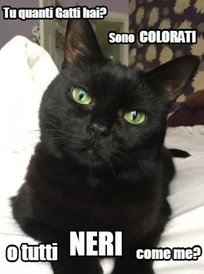 Make your own "Funny Tu quanti Gatti hai? Sono colorati o tutti neri come me?" meme with MemeCreator's free online meme generator. Add text, stickers, and drawings — then download or share. No watermark, no sign-up required.