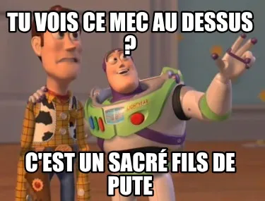 Make your own "Funny Tu vois ce mec au dessus ? C'est un sacré fils de pute" meme with MemeCreator's free online meme generator. Add text, stickers, and drawings — then download or share. No watermark, no sign-up required.