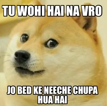 Make your own "Funny Tu wohi hai na vro Jo bed ke neeche chupa hua hai" meme with MemeCreator's free online meme generator. Add text, stickers, and drawings — then download or share. No watermark, no sign-up required.