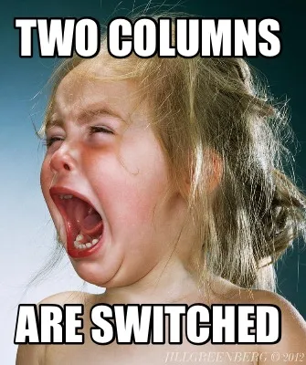 Make your own "Two columns Are switched" meme with MemeCreator's free online meme generator. Add text, stickers, and drawings — then download or share. No watermark, no sign-up required.