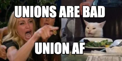 Make your own "Funny Unions are bad Union AF" meme with MemeCreator's free online meme generator. Add text, stickers, and drawings — then download or share. No watermark, no sign-up required.