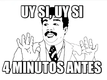 Make your own "Uy si, uy si 4 minutos antes" meme with MemeCreator's free online meme generator. Add text, stickers, and drawings — then download or share. No watermark, no sign-up required.