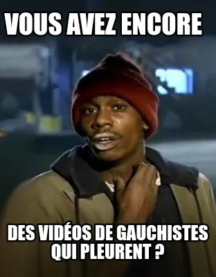 Make your own "Vous avez encore Des vidéos de gauchistes qui pleurent ?" meme with MemeCreator's free online meme generator. Add text, stickers, and drawings — then download or share. No watermark, no sign-up required.