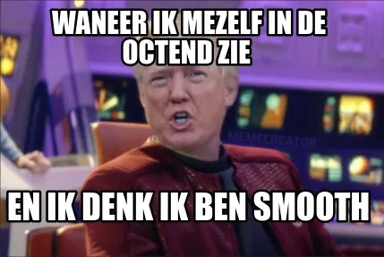 Make your own "Funny waneer ik mezelf in de octend zie en ik denk ik ben smooth" meme with MemeCreator's free online meme generator. Add text, stickers, and drawings — then download or share. No watermark, no sign-up required.