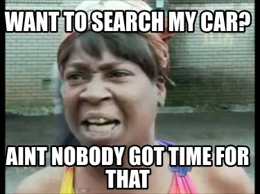 Make your own "Want to search my car? aint nobody got time for that" meme with MemeCreator's free online meme generator. Add text, stickers, and drawings — then download or share. No watermark, no sign-up required.