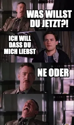 Make your own "Was willst du jetzt?! ich will dass du mich liebst ne oder" meme with MemeCreator's free online meme generator. Add text, stickers, and drawings — then download or share. No watermark, no sign-up required.