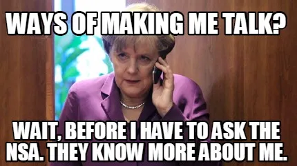 Make your own "Ways of making me talk? Wait, before i have to ask the NSA. They know more about" meme with MemeCreator's free online meme generator. Add text, stickers, and drawings — then download or share. No watermark, no sign-up required.