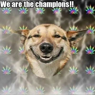 Make your own "Funny We are the champions!!" meme with MemeCreator's free online meme generator. Add text, stickers, and drawings — then download or share. No watermark, no sign-up required.