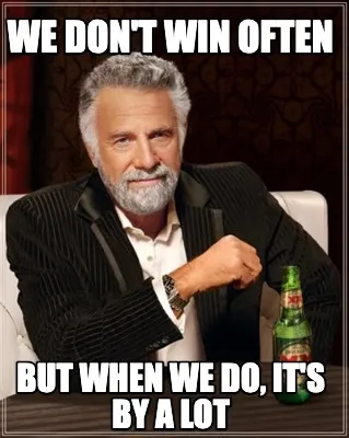 Make your own "We don't win often But when we do, it's by a lot" meme with MemeCreator's free online meme generator. Add text, stickers, and drawings — then download or share. No watermark, no sign-up required.