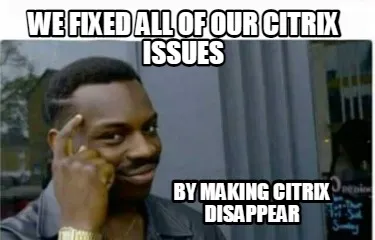 Make your own "Funny We fixed all of our CITRIX issues By making Citrix Disappear" meme with MemeCreator's free online meme generator. Add text, stickers, and drawings — then download or share. No watermark, no sign-up required.