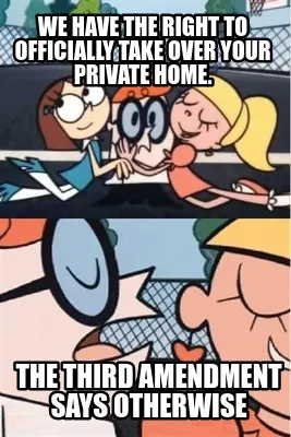 Make your own "We have the right to officially take over your private home. The third amendment" meme with MemeCreator's free online meme generator. Add text, stickers, and drawings — then download or share. No watermark, no sign-up required.