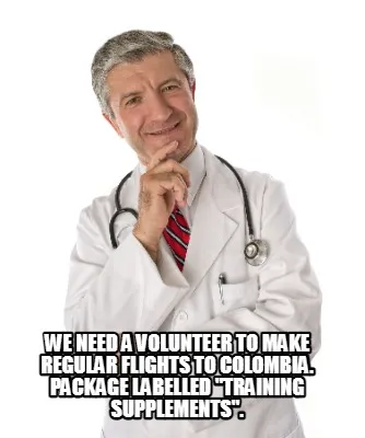 Create We need a volunteer to make regular flights to Colombia. Package labelled "trai Meme