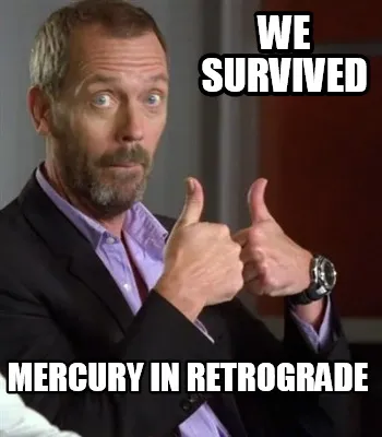 Make your own "We Survived Mercury in Retrograde" meme with MemeCreator's free online meme generator. Add text, stickers, and drawings — then download or share. No watermark, no sign-up required.