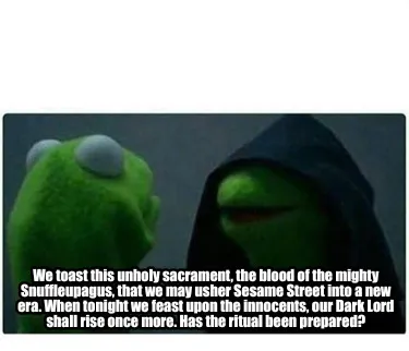 Make your own "We toast this unholy sacrament, the blood of the mighty Snuffleupagus, that we" meme with MemeCreator's free online meme generator. Add text, stickers, and drawings — then download or share. No watermark, no sign-up required.