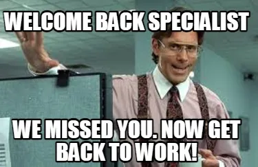 Create WELCOME BACK SPECIALIST WE MISSED YOU. NOW GET BACK TO WORK! Meme