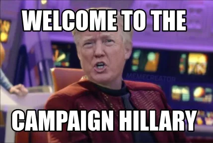 Make your own "WELCOME TO THE Campaign Hillary" meme with MemeCreator's free online meme generator. Add text, stickers, and drawings — then download or share. No watermark, no sign-up required.