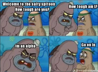 Make your own "Funny Welcome to the salty spitoon How tough are you? How tough am i? Im an alpha Go o" meme with MemeCreator's free online meme generator. Add text, stickers, and drawings — then download or share. No watermark, no sign-up required.