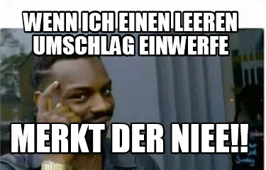 Make your own "Wenn ich einen leeren umschlag einwerfe Merkt der Niee!!" meme with MemeCreator's free online meme generator. Add text, stickers, and drawings — then download or share. No watermark, no sign-up required.