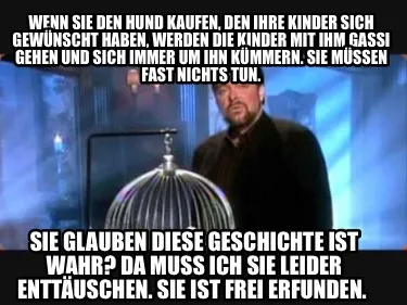 Make your own "Wenn sie den Hund kaufen, den ihre Kinder sich gewünscht haben, werden die Kind" meme with MemeCreator's free online meme generator. Add text, stickers, and drawings — then download or share. No watermark, no sign-up required.