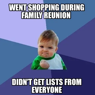 Create Went shopping during family reunion Didn't get lists from everyone Meme