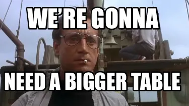 Make your own "Funny We’re gonna Need a bigger table" meme with MemeCreator's free online meme generator. Add text, stickers, and drawings — then download or share. No watermark, no sign-up required.
