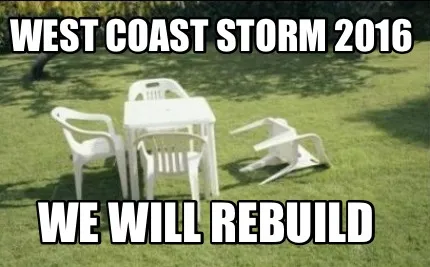 Make your own "West Coast Storm 2016 We will rebuild" meme with MemeCreator's free online meme generator. Add text, stickers, and drawings — then download or share. No watermark, no sign-up required.