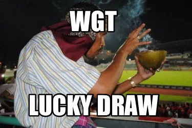 Make your own "WGT Lucky draw" meme with MemeCreator's free online meme generator. Add text, stickers, and drawings — then download or share. No watermark, no sign-up required.