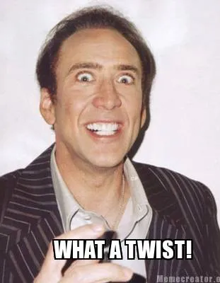 Make your own "WHAT A TWIST!" meme with MemeCreator's free online meme generator. Add text, stickers, and drawings — then download or share. No watermark, no sign-up required.