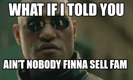 Make your own "What if I told you Ain't nobody finna sell fam" meme with MemeCreator's free online meme generator. Add text, stickers, and drawings — then download or share. No watermark, no sign-up required.