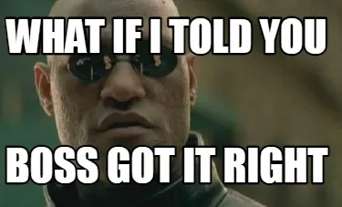 Make your own "Funny what if i told you boss got it right" meme with MemeCreator's free online meme generator. Add text, stickers, and drawings — then download or share. No watermark, no sign-up required.
