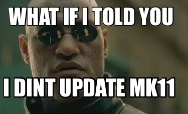 Make your own "What if I told you I dint update MK11" meme with MemeCreator's free online meme generator. Add text, stickers, and drawings — then download or share. No watermark, no sign-up required.