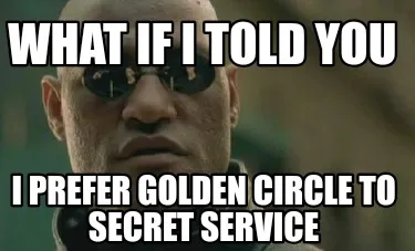 Make your own "What If I told you I prefer Golden Circle to Secret Service" meme with MemeCreator's free online meme generator. Add text, stickers, and drawings — then download or share. No watermark, no sign-up required.