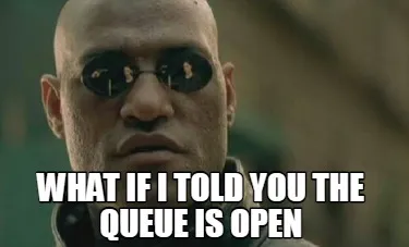 Make your own "Funny What if I told you the queue is Open" meme with MemeCreator's free online meme generator. Add text, stickers, and drawings — then download or share. No watermark, no sign-up required.