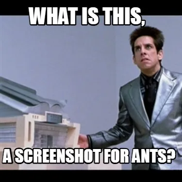 Make your own "Funny What is this, a screenshot for ants?" meme with MemeCreator's free online meme generator. Add text, stickers, and drawings — then download or share. No watermark, no sign-up required.