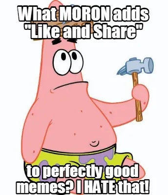 Make your own "Funny What MORON adds "Like and Share" to perfectly good" meme with MemeCreator's free online meme generator. Add text, stickers, and drawings — then download or share. No watermark, no sign-up required.