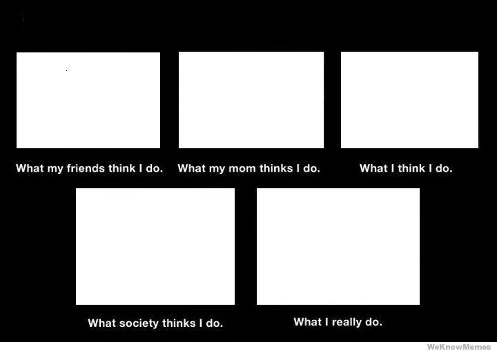 What People Think I Do vs What I Actually Do, the six-panel format for showing how different groups see your job, hobby, or lifestyle, what you imagine yourself doing, and what you actually spend your time on. Works for every profession.