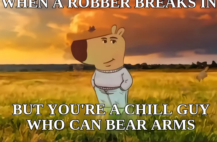 Make your own "WHEN A ROBBER BREAKS IN — BUT YOU'RE A CHILL GUY WHO CAN BEAR ARMS" meme with MemeCreator's free online meme generator. Add text, stickers, and drawings — then download or share. No watermark, no sign-up required.