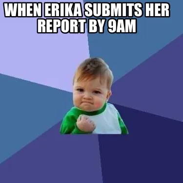 Make your own "Funny When Erika submits her report by 9am" meme with MemeCreator's free online meme generator. Add text, stickers, and drawings — then download or share. No watermark, no sign-up required.